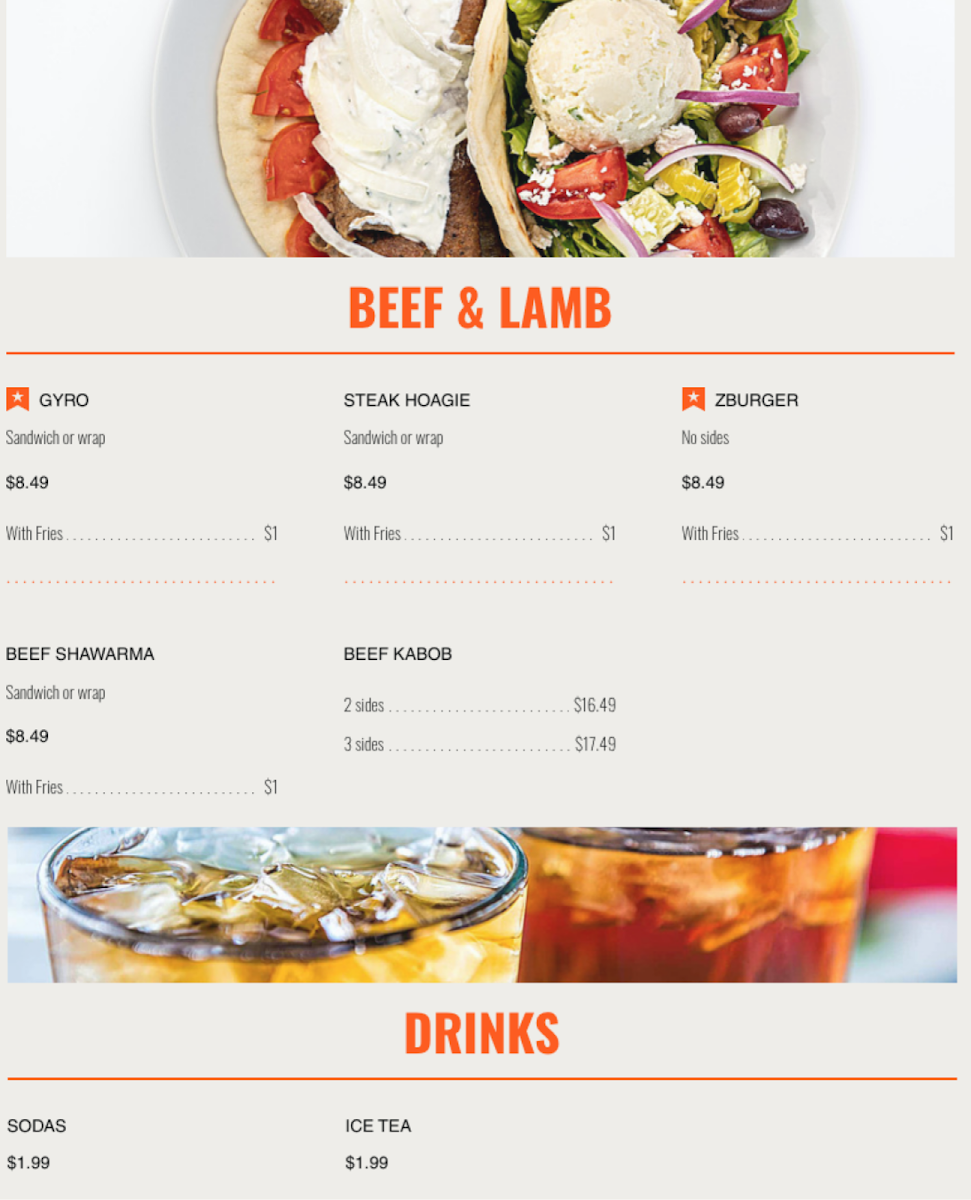 “ Zeros Mediterranean Grill was decent. We got the lamb gyro with fries and a chicken gyro. The food was good but in the lamb gyro it had very little lettuce and tomato and the meat was a little bit too salty. The tzatziki was a bit too garlicky. Overall it was okay ”